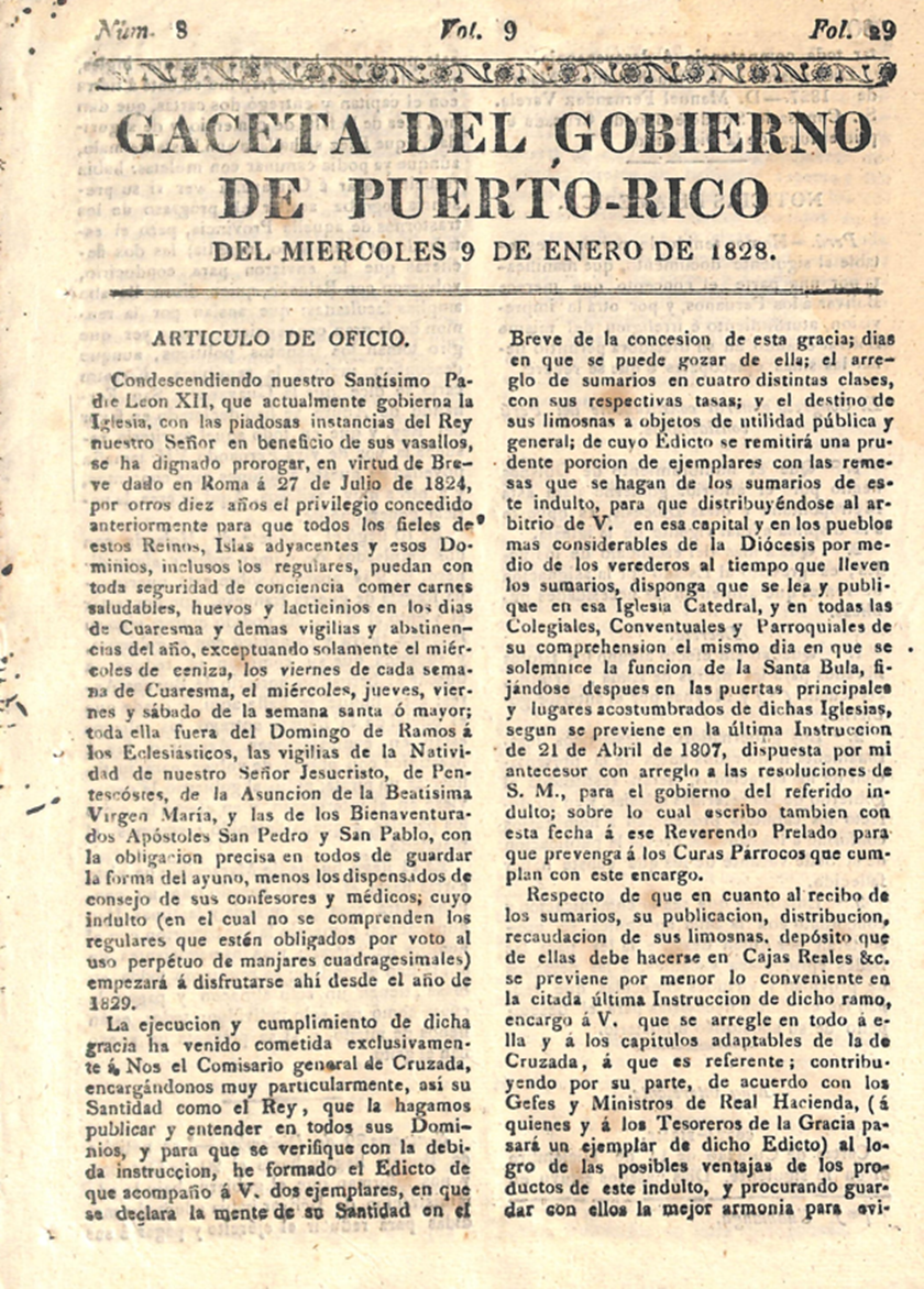 Gaceta del Gobierno de Puerto Rico. 26 de enero del 1828.