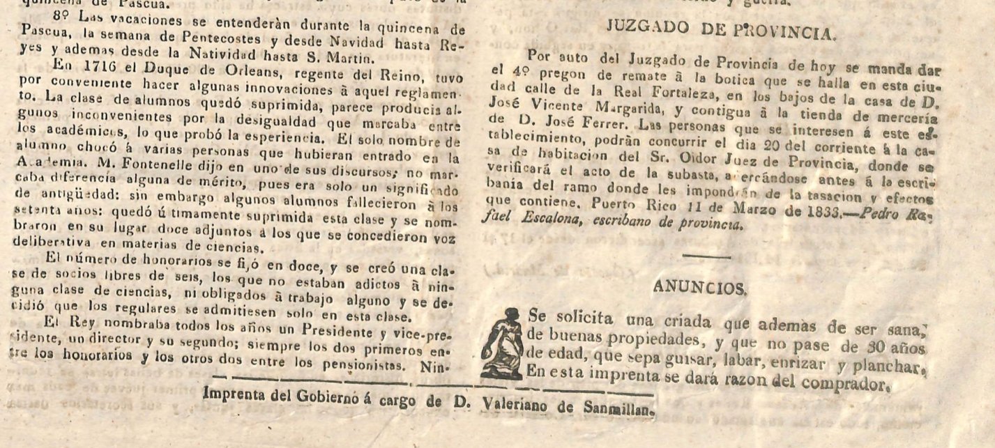 “Anuncios.” Gaceta del Gobierno de Puerto Rico. 23 de mayo del 1833.