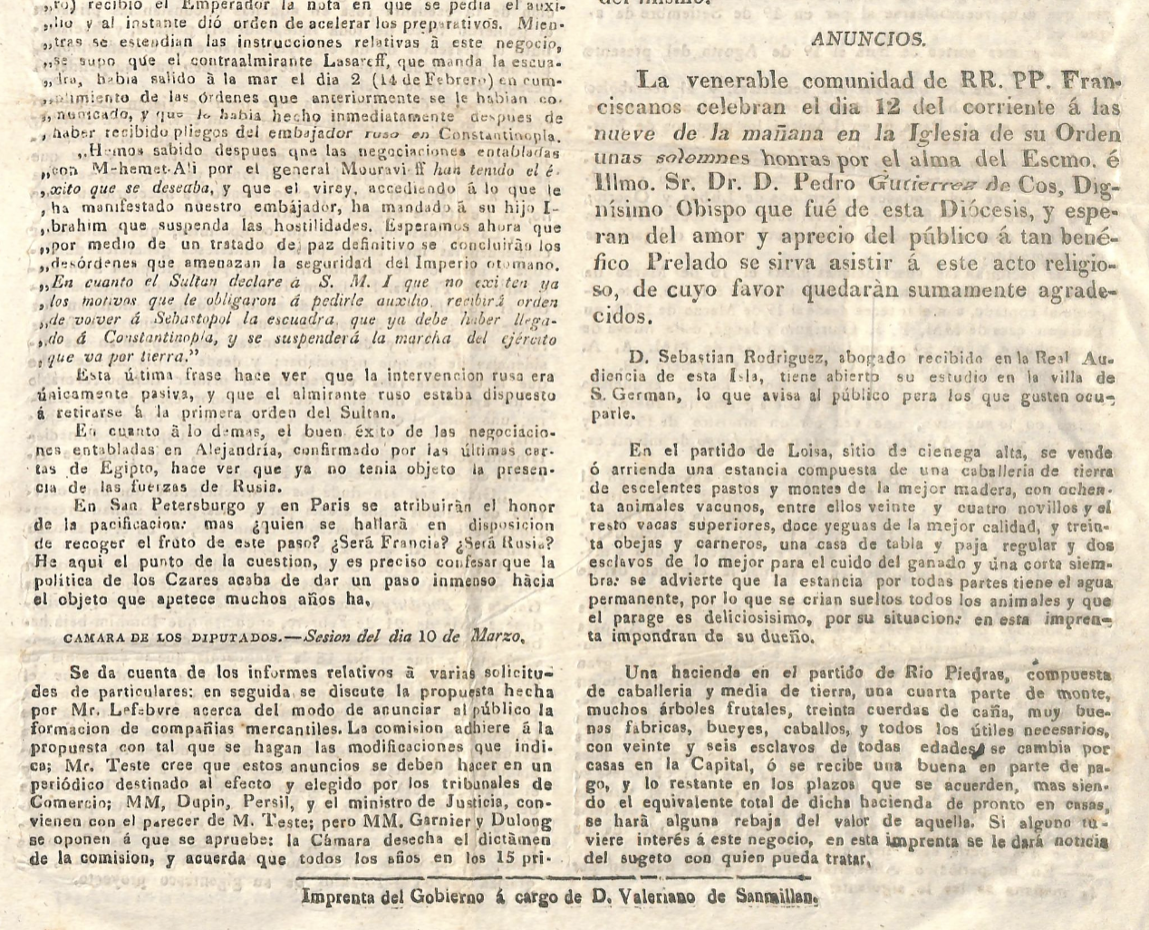“Una hacienda en el partido de Rio Piedras, compuesta de caballería y media de tierra, una cuarta parte de monte, muchos árboles frutales, treinta cuerdas de caña, muy buenas fabricas, bueyes, caballos, y todos los útiles necesarios, con veinte y seis esclavos de todas edades se cambia por casas en la Capital, ó se recibe una buena en parte de pago, y lo restante en los plazos que se acuerden, más siendo el equivalente total de dicha hacienda de pronto en casas, se hará alguna rebaja del valor de aquella. Si alguno tuviere interés a este negocio, en esta imprenta se le dará noticia del sujeto con quien pueda tratar”