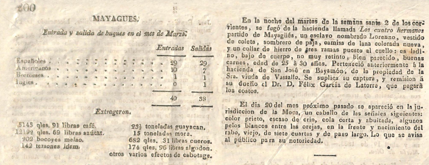 “En la noche del martes de la semana santa 1 de los corvientes, se fugó de la hacienda llamada Los cuatro hermanos partido de Mayagüés, un esclavo nombrado Lorenzo, vestido de colete, sombrero de paja, camisa de lana colorada nueva, y un collar de hierro de tres ramas puesto al cuello: es ladino, bajo de cuerpo, no muy retinto, bien parecido, buenas carnes, edad de 25 á 30 años. Perteneció anteriormente á la Sra. Viuda de Vasallo. Se suplica su captura, y remisión a su dueño el Dr. D. Félix Garcia de Latorre, que pagará los costos.”