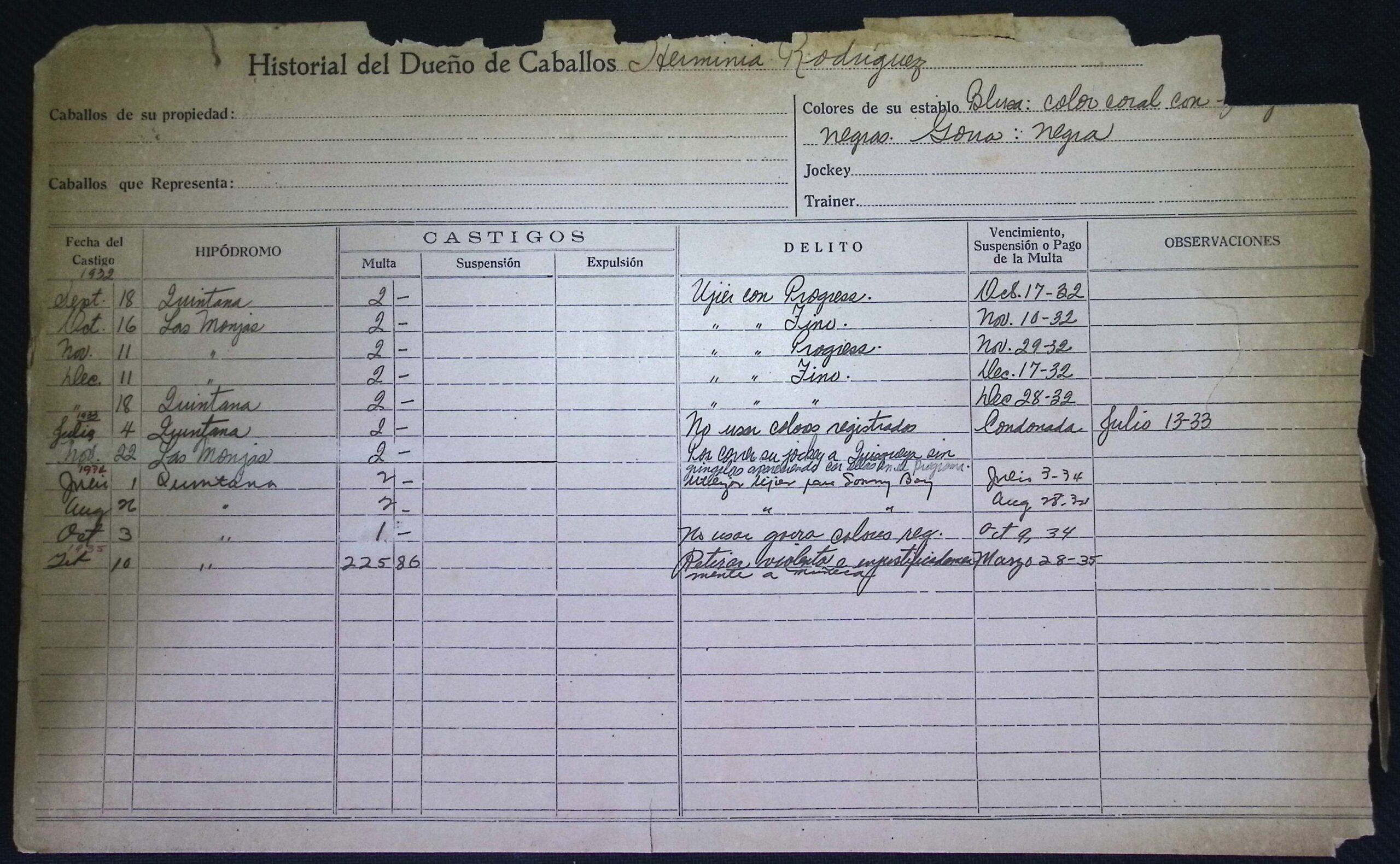 Algo en particular que me llamó la atención fueron las categorías raciales encontradas en las solicitudes tanto de cuadreros, como de jinetes. Entre 1920 y 1950, aparecen en las solicitudes las categorías negro, blanco, trigueño y mulato. También encontré que la mayoría de los participantes en la industria hípica puertorriqueña eran hombres provenientes de la isla, aunque también vinieron de países como Estados Unidos, Trinidad y Venezuela. En toda la documentación manejada aparecen muy pocos nombres de mujeres. Estos elementos pudiesen ser motivos de investigación, ya que permiten una mirada a algunas dinámicas sociales del Puerto Rico de principios y mediados del siglo XX. Sería interesante también mirar el desarrollo del deporte hípico en un Puerto Rico que atravesaba periodos de profundas transformaciones sociales y económicas, tales como el cambio de soberanía, las posteriores construcciones militares estadounidenses, la industrialización y urbanización del archipiélago y las migraciones del campo a los nuevos centros urbanos, entre otras. Así, este fondo es idóneo para investigaciones de la historia económica, de estudios de mujer y género, de estudios de raza y racialización, de historia deportiva, entre muchos otros. ¿De qué maneras, si alguna, afectó al deporte hípico la industrialización y urbanización de Puerto Rico? ¿Vio el deporte hípico la integración de quienes bajaron del campo a la ciudad? ¿Representó el hipismo una oportunidad laboral para estas personas migrantes? ¿Qué rol jugaron las mujeres en esta industria? ¿Quiénes tuvieron acceso al hipismo temprano?