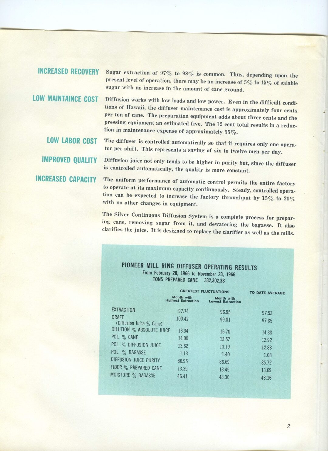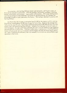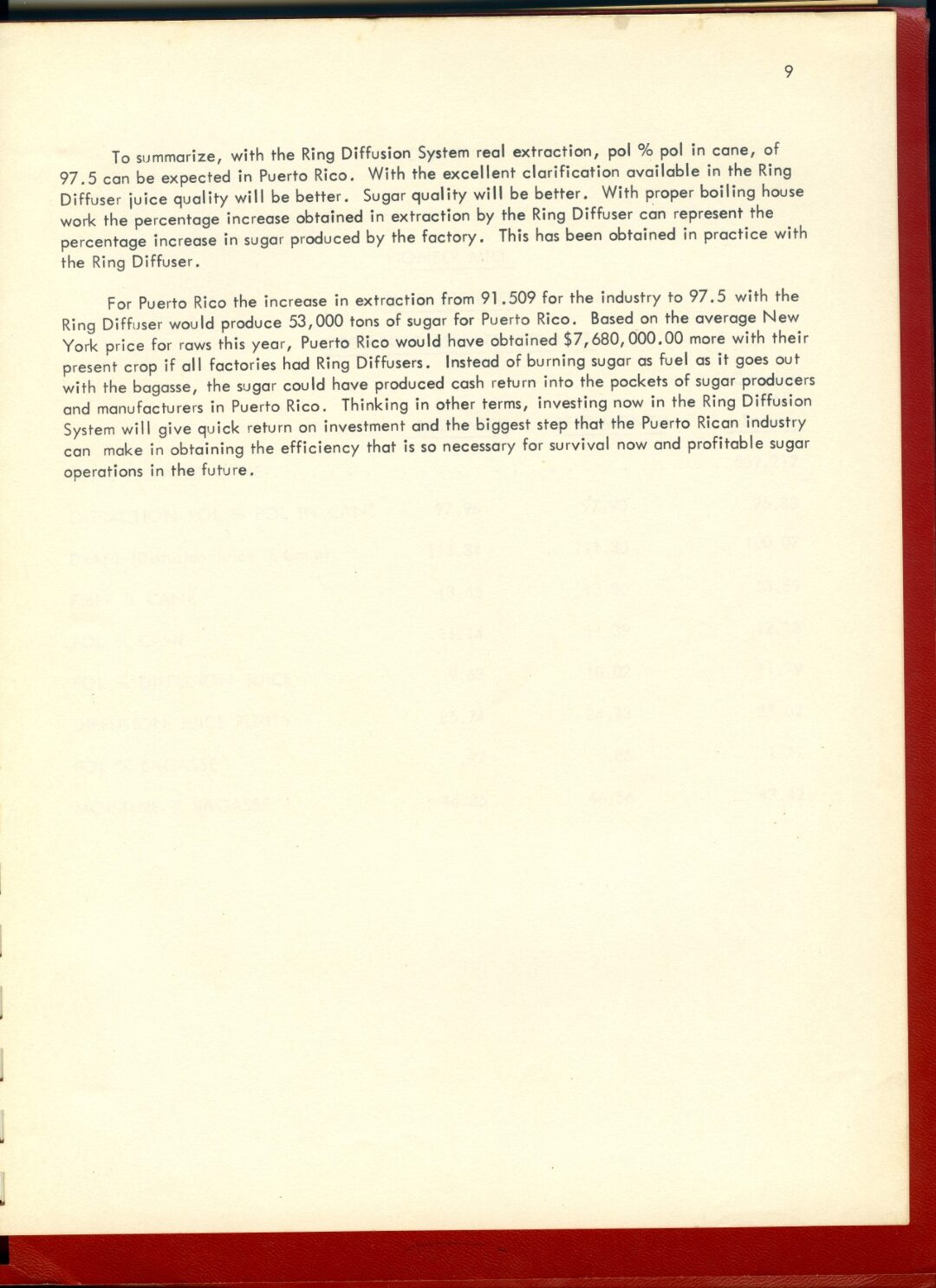 For Puerto Rico, the increase in extraction from 91.509 for the industry to 97.5 with the Ring Diffuser would produce 53,000 tons of sugar for Puerto Rico. Based on the average New York Price for raws this year, Puerto Rico would have obtained $7,680,000.00 more with their present crop if all factories had Ring Diffusers. Instead of burning sugar as fuel as it goes out with the bagasse, the sugar could have produced cash returns into the pockets of sugar producers and manufacturers in Puerto Rico. Thinking in other terms, investing now in the Ring Diffusion System will give a quick return on investment and the biggest step that the Puerto Rican industry can make in obtaining the efficiency that is so necessary for survival now and profitable sugar operations in the future.[7]