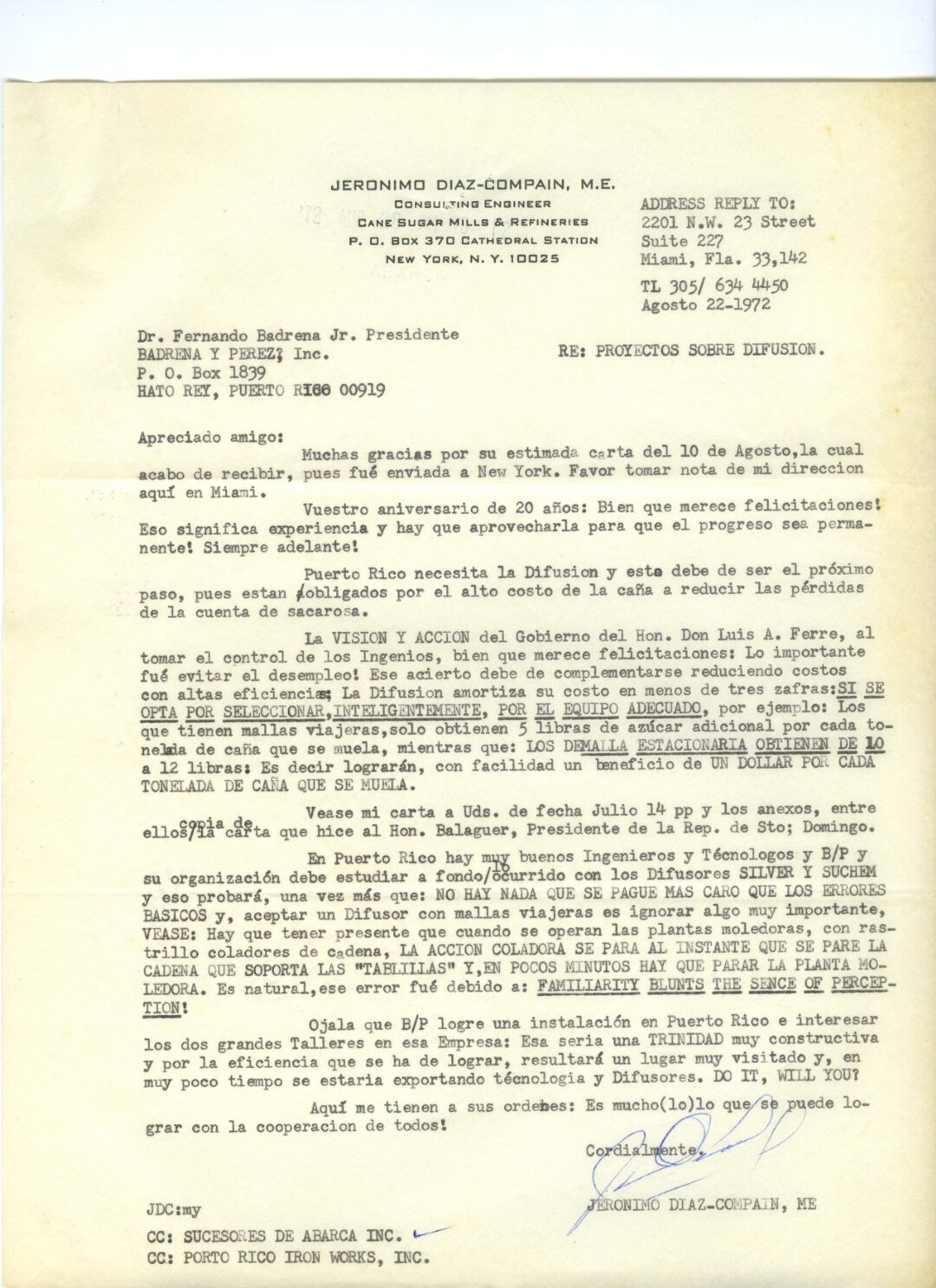 [8] Jerónimo Díaz, Carta al Dr. Fernando Badrena Jr., 22 de agosto de 1972, Caja 55, Colección Fundición ABARCA, Archivo de la AACUPR.