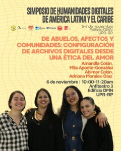 El jueves 6 de noviembre a las 10:00am, Amandla Colón estará presentando en el panel “De abuelos, afectos y comunidades: configuración de archivos digitales desde una ética del amor”, junto a Mila Aponte González, Abimar Colón y Adriana Morales Díaz.