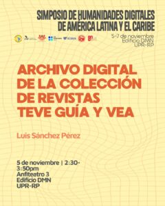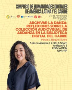 Nuestra coordinadora de digitalización, Paula Roque Rivera, presentará su panel “Archivar la danza: Reflexiones sobre la colección audiovisual de Andanza en la Biblioteca Digital del Caribe”, que se llevará a cabo el miércoles 5 de noviembre a las 2:30pm. En esa misma sesión, el pasante Luis Sánchez Pérez presentará su proyecto “Archivo digital de la colección de revistas Teve Guía y Vea”.