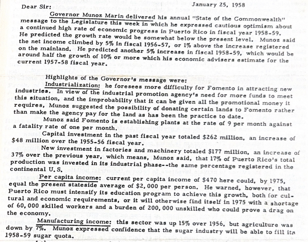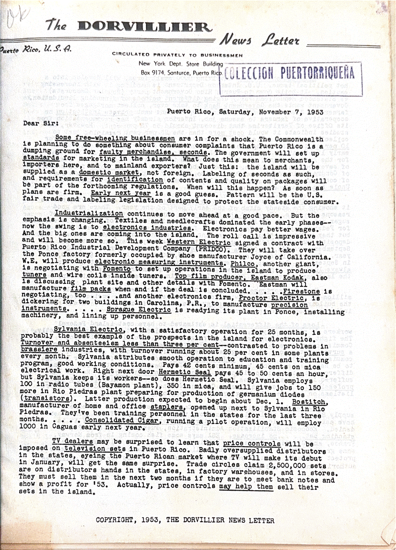 Print media plays a role in understanding the development of these themes, and with that comes the Dorvillier News Letter, also known as the Dorvillier Business News Letter. The Dorvillier News Letter was founded by Massachusetts native William J. Dorvillier in 1953. Dorvillier is better known for creating the San Juan Star, which, under his supervision, would win the Pulitzer Prize in 1960 for criticizing Catholic bishops for forbidding Catholics from voting for the Popular Democratic Party.[1] While the San Juan Star is what Dorvillier is most known for, the Dorvillier News Letter is of particular interest due to its role as an English news source focused on business and investment developments in Puerto Rico during the early years of the ELA.