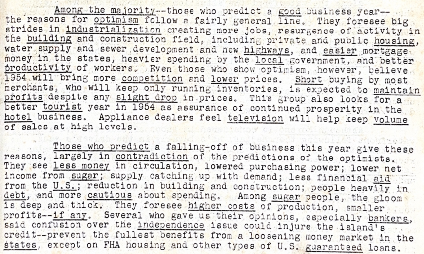 While the newsletter does lean towards economic optimism, it does bring attention to the growing concerns with labor loss. The juxtaposition between the optimism of economic growth and the pessimism of workers is at the forefront of much of the dialogue. For example, while one article in the November 7th issue opens with “Liquidation of PRRA (The Puerto Rico Reconstruction Administration), involving 8000 small farms, will develop into a hot political issue,” a week later, Dorvillier exclaims that “If you think industrial development has been impressive in the last few years, you haven’t seen anything yet!”[4] The News Letter is ultimately presented through a capitalist lens that views economic growth and industrialization as the primary markers for economic success, which Puerto Rico was achieving throughout the 1950s and 1960s. While industry did undoubtedly grow, some fears of instability remained. The growing concerns are seen throughout the progression of the newsletter’s narrative: