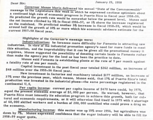 The duality between economic growth and anxieties is no better presented than in Governor Luis Muñoz Marín’s 1958 annual address at the “State of the Commonwealth.” Muñoz Marín explains that while capital investments are up, attracting new industries is becoming increasingly complex. Similarly, per capita income is increasing, but it comes with a warning that a labor shortage will occur if specific demands are unmet. While manufacturing income was up 15%, agriculture was down by 7%. While wages are acknowledged, Muñoz Marín directs workers not to rely on government-set wages but to instead bargain for their wages. The signs of economic prosperity with an underlying forewarning are a trend that defines The Dorvillier.