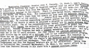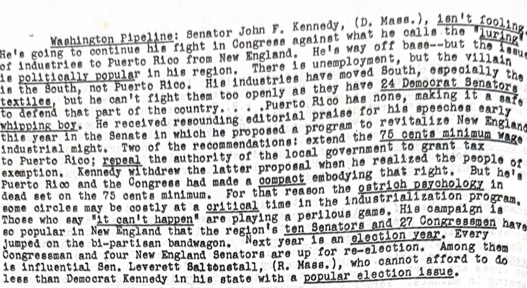 In the November 7th, 1953, issue, the Newsletter brings attention to the qualms brought forth by then Democrat Senator (MA) and future US President, John F. Kennedy. Sen. Kennedy brings attention to what he sees as a potential drain on industry in Massachusetts due to the luring of Puerto Rico’s cheaper labor. The counterargument presented by The Dorvillier is that the industry is moving south rather than to Puerto Rico, but the politicization of Puerto Rico’s industry is a point of interest. The Dorvillier rehashes this topic multiple times and clarifies that Puerto Rico should not be seen as the source of New England’s labor drainage. This rhetoric may be indicative of the broader trend of anti-Puerto Rican sentiments that were growing throughout the United States, referred to as the “Puerto Rican problem”.[5]