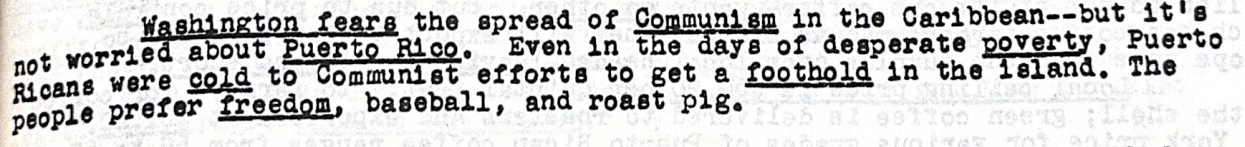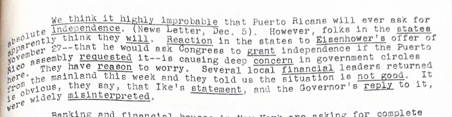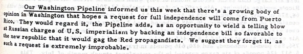 Questions surrounding Puerto Rico’s status are also a point of interest in the Pipeline. The “independence questions” are acknowledged throughout 1953 as the conversations of Hawaiian statehood began to gain steam. Fears of independence talk seem to be a prominent concern and are tied to anti-communist sentiments. Still, by 1954, independence was waved away as an improbable fringe position often accompanied by radicalism.