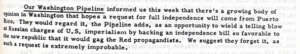 The “Washington Pipeline” is a section included in the issues found in the first two volumes (1953-1955). The pipeline focuses on insider knowledge of political developments, and it is one that I see as the most unique and essential to developing the identity of the newsletter in its early years. It is unclear who provided the newsletter with the information in the pipeline. Still, it gives us insight into which policies and conversations were significant for the “businessman.” This section is central in propagating themes of industrial development, concerns surrounding the impact of migration on Puerto Rico and the US mainland, labor demands and instability, and a variety of other issues, like the debate on statehood.