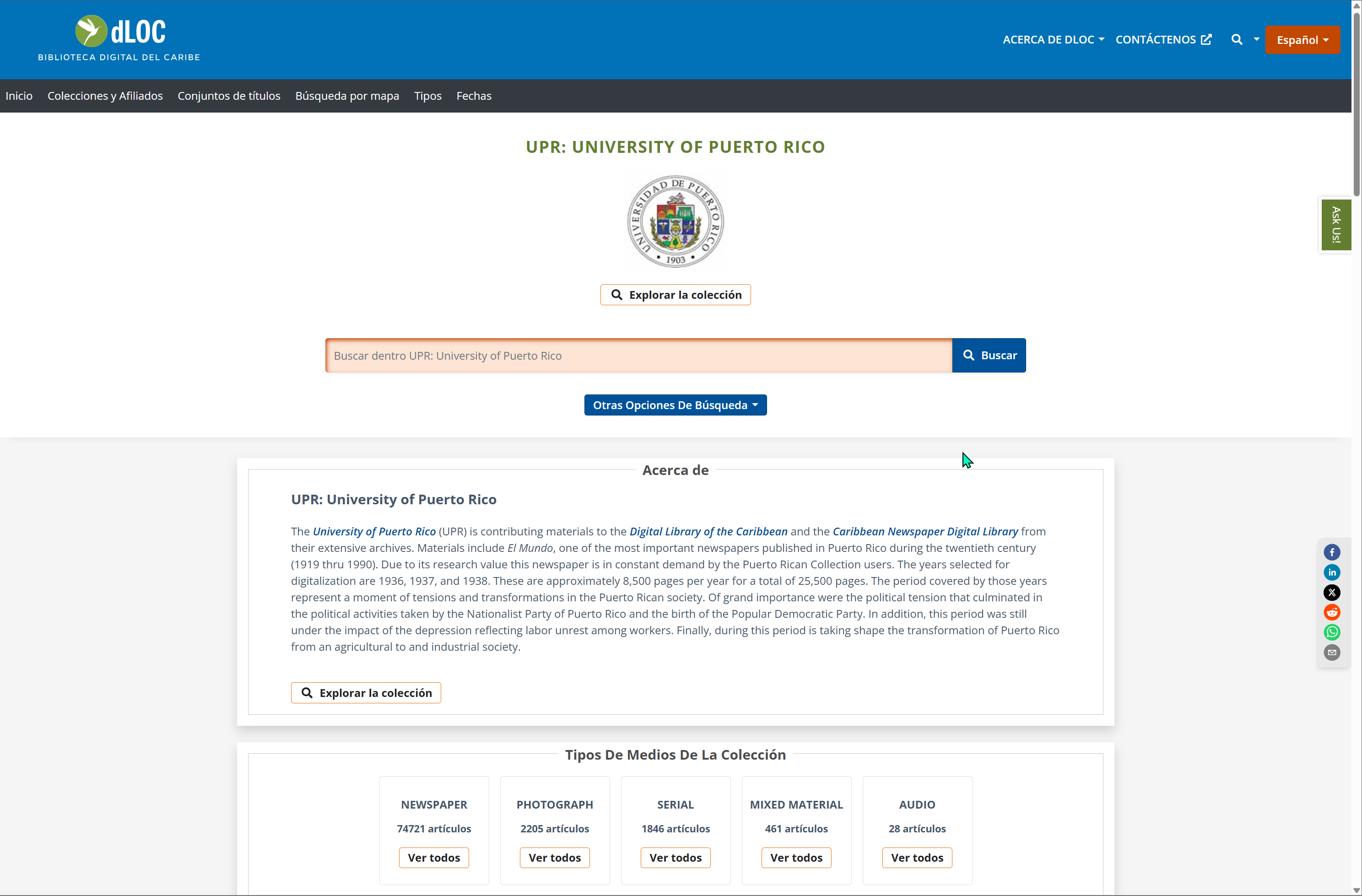 La Biblioteca Digital del Caribe (DLOC), basada en la Universidad de Florida, provee acceso a cientos de ítems publicados en Puerto Rico. El portal de DLOC, que proporciona acceso a los materiales asociados a la UPR, es uno de varios puntos de entrada para investigar sobre Puerto Rico.