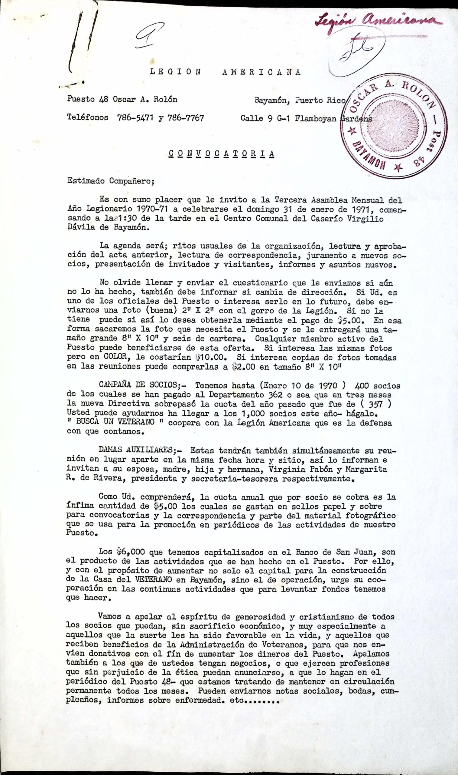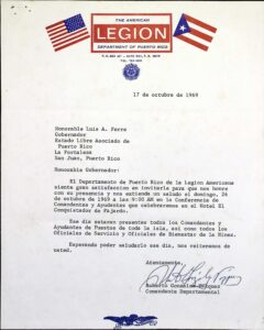 De igual manera, se refleja la condición de la American Legion como grupo de presión, lo cual se observa particularmente en su gestión para la adquisición de tierras pertenecientes al Hospital San Patricio (asunto que parecía ser el de mayor importancia en la correspondencia disponible en el cartapacio consultado), así como los estrechos vínculos de la AL con el poder ejecutivo en Puerto Rico mediante el intercambio de correspondencia y peticiones de reunión con el gobernador.[67] No obstante, es posible que estos vínculos se hayan iniciado desde alguna de las administraciones anteriores, ya que en una misiva de Eduardo Cuchí Coll, presidente del Comité Legislación Legión Americana, dirigida a Ferré Aguayo el 19 de diciembre de 1968 (cuando este aún no había asumido el cargo de gobernador), el primero le solicita al mandatario electo un aumento a la cantidad asignada por el gobierno a los gastos del departamento de Puerto Rico de la AL, lo cual implica que esta entidad era subvencionada por el gobierno colonial, o mejor dicho, por los contribuyentes puertorriqueños.[68]