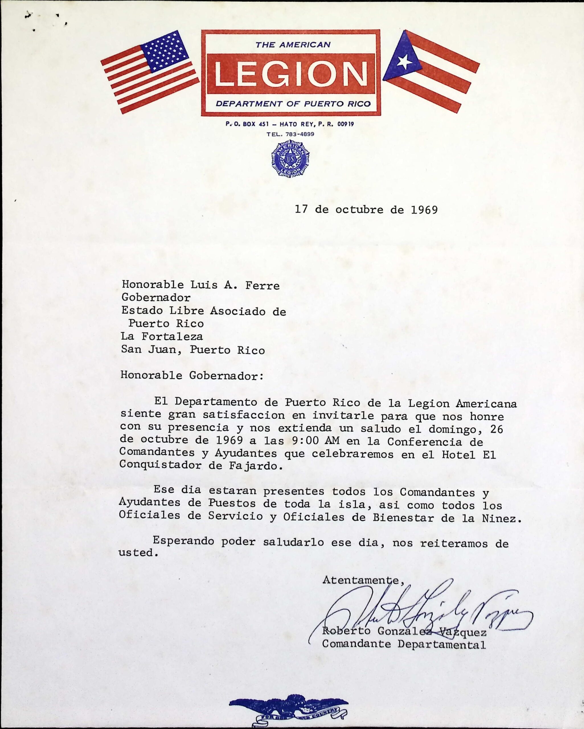[4] En cuanto a la presencia de la AL en Puerto Rico véase, Legión Americana, Convocatoria, Bayamón, 1971, Archivo General de Puerto Rico, Fondo Fortaleza, Serie #1, Correspondencia General, Sub-fondo Hon. Luis A. Ferré, caja #37. Refiérase también a “Contra-referencia de Carta en rellcion [sic.] con el interés del Puesto Núm. 49 de la Legion Americana de adquirir, mediante compra, un predio de terreno de la Autoridad de Tierras para el establecimiento de su casa-club”, 19 de diciembre de 1969, Archivo General de Puerto Rico Archivo General de Puerto Rico, Fondo Fortaleza, Serie #1, Correspondencia General, Sub-fondo Hon. Luis A. Ferré, caja #37.. Ver también Manuel Juarbe, “misiva de Manuel Juarbe a Raúl Roque Colón”, 10 de diciembre de 1969, Archivo General de Puerto Rico, Fondo Fortaleza, Serie #1, Correspondencia General, Sub-fondo Hon. Luis A. Ferré, caja #37. Sobre el departamento de la AL en Puerto Rico, véase Eduardo Cuchí Coll, “misiva de Eduardo Cuchí Coll a Luis A. Ferré”, 19 de diciembre de 1968, Archivo General de Puerto Rico, Fondo Fortaleza, Serie #1, Correspondencia General, Sub-fondo Hon. Luis A. Ferré, caja #37. La información sobre el puesto 52, así como respecto a un «Distrito dos» de la AL en Puerto Rico (este último aún no ha sido estudiado) provino de una misiva enviada por Raúl Barreras, comandante departamental de la AL en Puerto Rico, al gobernador Ferré Aguayo, solicitándole indulto para Luis Rivera Piloto y Víctor Salgado (ambos de la AL). Se desconocen las acusaciones que pesaban en su contra. Raúl Barreras, M.D, “misiva de Raúl Barreras, M.D. al Hon. Luis A. Ferré”, 29 de noviembre de 1971, Archivo General de Puerto Rico, Fondo Fortaleza, Serie #1, Correspondencia General, Sub-fondo Hon. Luis A. Ferré, caja #95.