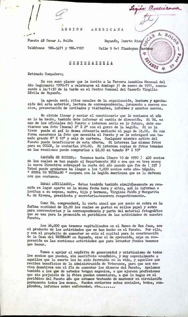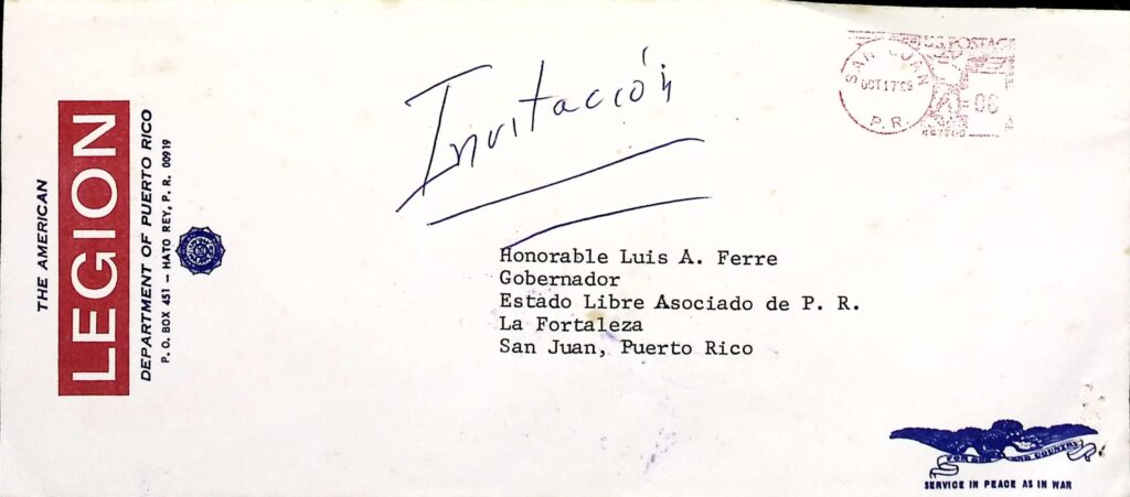 El acervo del departamento establecido en Puerto Rico está en proceso de explorarse y, por el momento, consiste únicamente de un cartapacio con una serie de documentos entre los que se encuentran invitaciones de la organización a funcionarios del gobierno de Puerto Rico entre 1968 y 1971, algunas dirigidas al gobernador Luis A. Ferré Aguayo y a uno de sus ayudantes especiales en La Fortaleza, Aurelio Torres Campos, así como informes producidos por la organización en relación, principalmente, al establecimiento de un hospital para veteranos puertorriqueños.[9] Este legajo forma parte de la colección de Ferré Aguayo del fondo Fortaleza y fue hallado en una caja de cartón junto con otros documentos no relacionados. Este aspecto, al igual que el que se trate en su mayoría de planes de proyectos cuya puesta en práctica se desconoce hasta el momento (con excepción del Centro Hemisférico Técnico-Cultural Norte-Sur, cuyos documentos más antiguos en Puerto Rico datan de 1971),[10] supone una limitación metodológica que deberá ser superada en futuros acercamientos a este acervo. Por tal razón, el estudio realizado en este artículo de los referidos documentos de la organización en cuestión ha sido complementado con otros encontrados en otras cajas y cartapacios.[11] De hecho, aún no existe en Puerto Rico, guía o inventario alguno sobre los documentos generados por o relacionados con la AL en Puerto Rico. De igual manera, debe puntualizarse que aún no existe bibliografía sobre la presencia de AL en Puerto Rico, exceptuando alusiones a esta en trabajos como A History of the American Legion de Richard Seylee Jones (1946), Puerto Rico Under Colonial Rule: Political Persecution and the Quest for Human Rights de Ramón Bosque Pérez (2006) e Historia de la lucha por la independencia de Puerto Rico: una lucha por la soberanía y la igualdad social bajo el dominio estadounidense del historiador José (Ché) Paralitici (2017).[12] Por tal razón, debido a la carencia de historiografía al respecto, los documentos hallados suponen una fuente primaria insustituible para el estudio de la presencia de la AL en Puerto Rico durante la Guerra Fría.